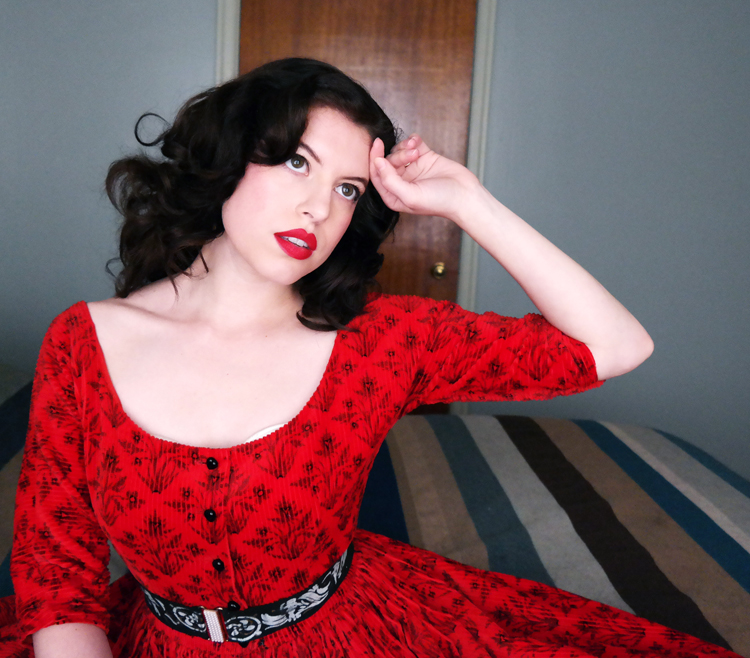 When I first tried this dress on at Living Threads Vintage I was blond, and while it was a lovely dress that ticked to many boxes, I wasn't feeling it. About a month later I went back and tried it on with darker locks and it seems that was the key, and I've worn it every chance I get since. It's 1950's Lanz, one of my very favorite labels, and made of wide wale corduroy, and I just LOVE what the 50's did with corduroy.